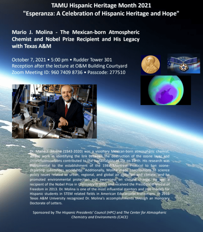 Dr. Mario J. Molina (1943-2020) was a visionary Mexican-born atmospheric chemist, whose work in identifying the link between the destruction of the ozone layer and chlorofluorocarbons contributed to the sustainability of life on Earth. His work and legacy were celebrated during the TAMU Hispanic Heritage Month 2021.
